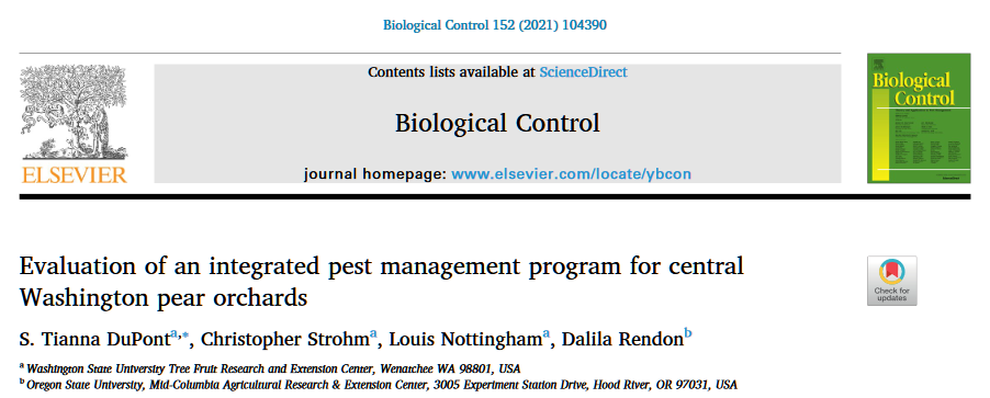 Dupont, T., C. Strohm, L. B. Nottingham and D. Rendon. 2021. Evaluation of an integrated pest management program for central Washington pear orchards. Biol. Control. 152: 104390.