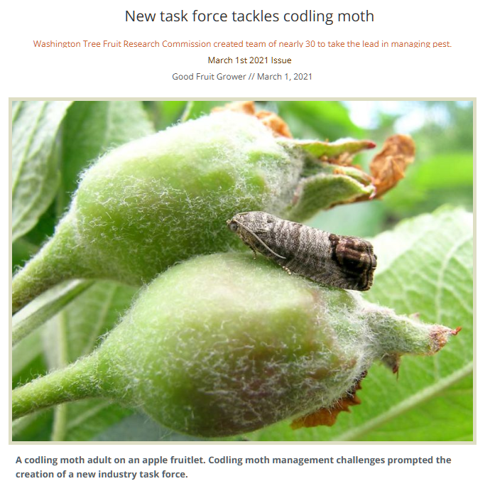 Nottingham, L,, C. Adams, E. Beers, M. Doerr, and D. Epstein. 2021. New task force tackles codling moth. Good Fruit Grower Magazine, March 1, 2021. https://www.goodfruit.com/new-task-force-tackles-codling-moth/