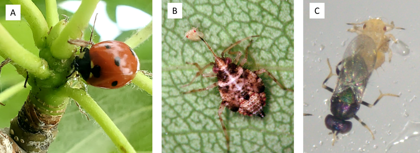 All the methods suggested above will have low impacts on natural enemies. Natural enemies like lady beetles (Fig. 2A), predatory bugs (Fig. 2B), and parasitoid wasps (Fig. 2C) are critical to prevent psylla and mite population explosions closer to harvest, and they do it for free! So avoid broad spectrum materials, especially multiple products at a time.