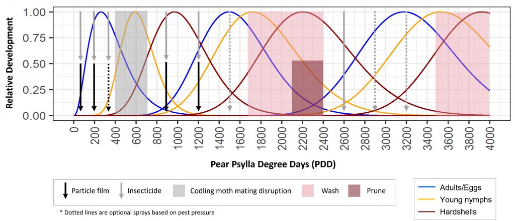 In order to help you choose the right approach for your orchard and better understand the development of pear psylla in your region, WSU has created a pear psylla degree day model and associated management strategies. Visit the new page Phenology Based Pear Psylla Integrated Pest Management for the model and strategies. The website is a work in progress and subject to change as we continue to perform experiments and refine the conventional and organic management strategies.